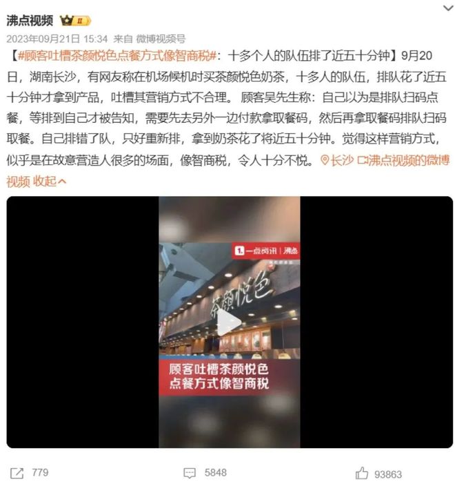 曾经就有消费者吐槽,在茶颜悦色买杯奶茶,得先排队下单拿取餐码,然后再排队取餐,十多个人的队伍,常常要排近50分钟。