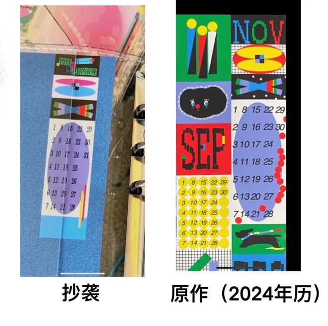从对比图中可以清晰地看到,茶颜悦色手账本中涉及日历的一页,从颜色、图形、形状到整体设计,都与“废画三千”2024年设计的年历极为相似,几乎可以说是如出一辙。